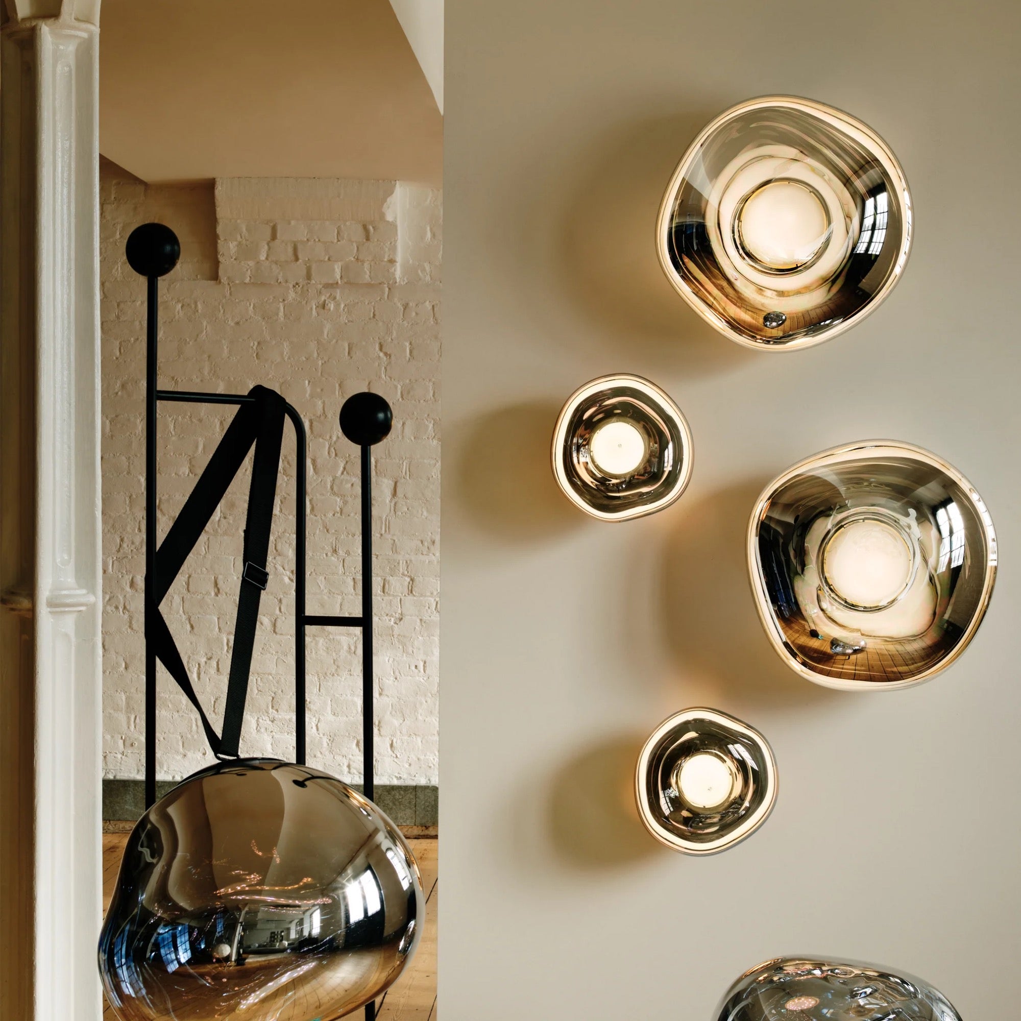 The Melt surface light is a beautifully distorted small surface light in a modern Chrome finish. Featuring an integrated LED module, it creates a mesmerizing hot-blown glass effect when on and a mirror-finish effect when off. Made in Germany using high-tech manufacturing, it evokes molten glass or the interior of a melting glacier.
