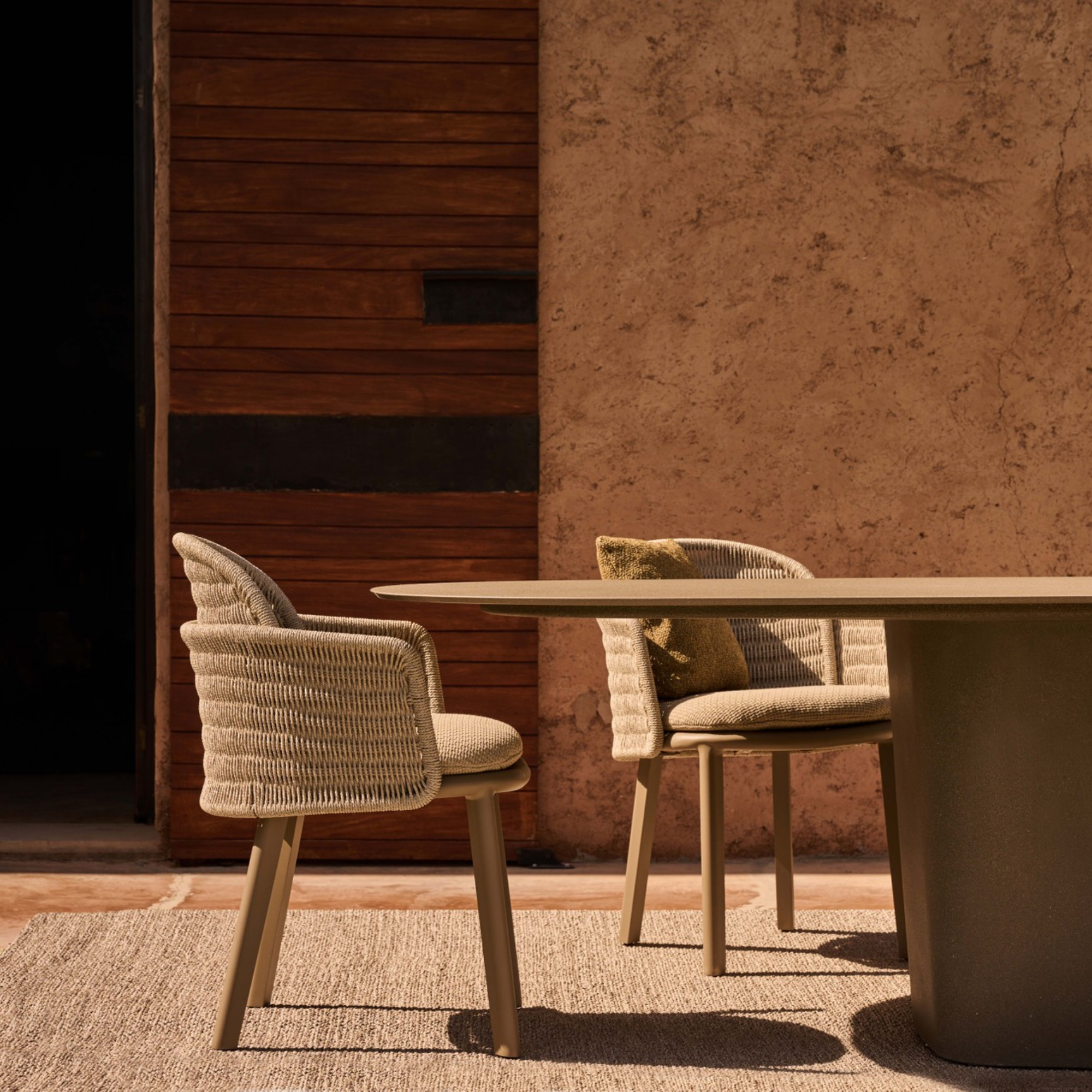The Suro Armchair combines elegant teak or powder-coated aluminium with flexible braided rope, creating a striking, cocoon-like design. Its fibre backrest offers exceptional comfort, while the sturdy frame and rounded form provide both support and a sculptural, inviting presence for outdoor spaces.