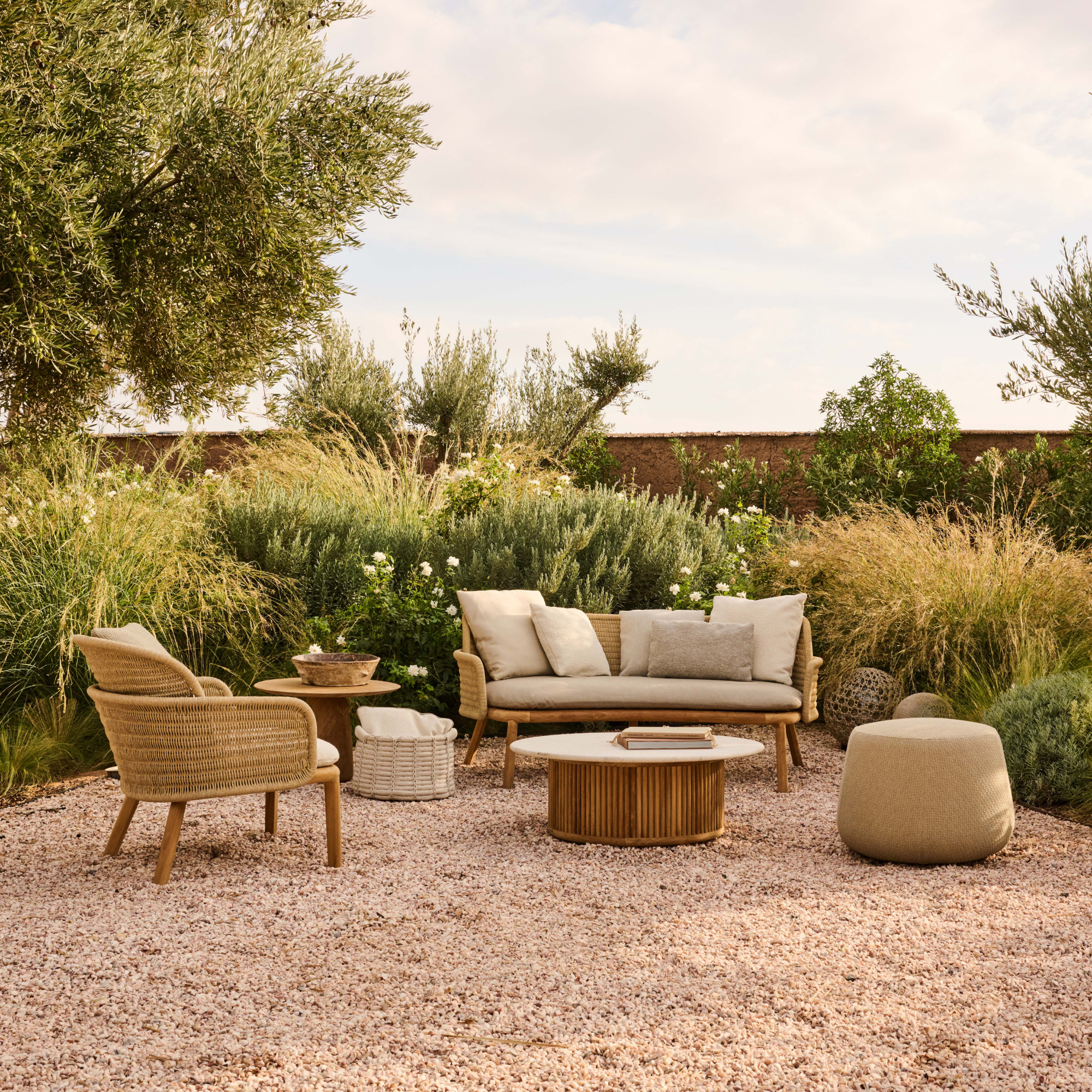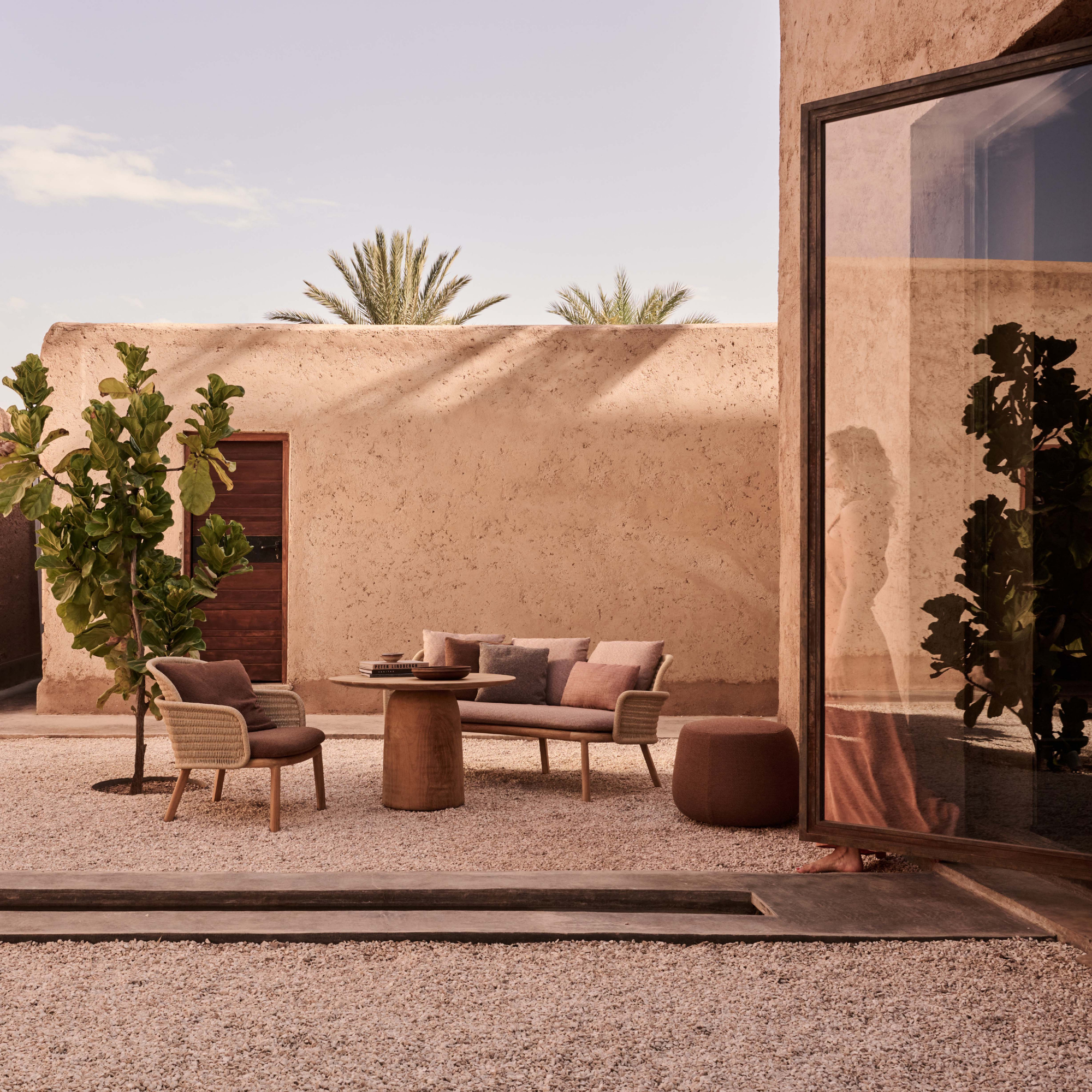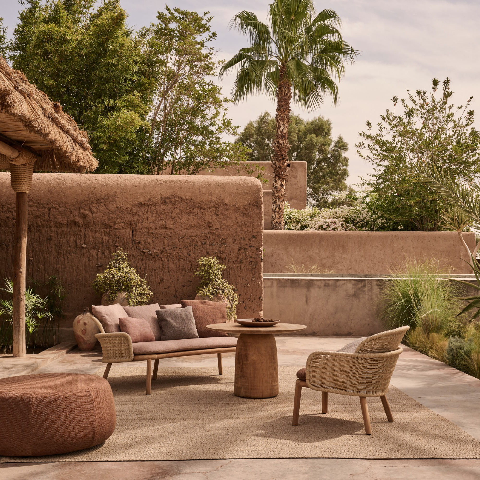 The Suro Banquette combines teak or powder-coated aluminium with braided rope for a striking, cocoon-like design. Its rounded fibre backrest provides exceptional comfort, while the sturdy frame ensures durability, making it a sculptural and inviting addition to any outdoor space.