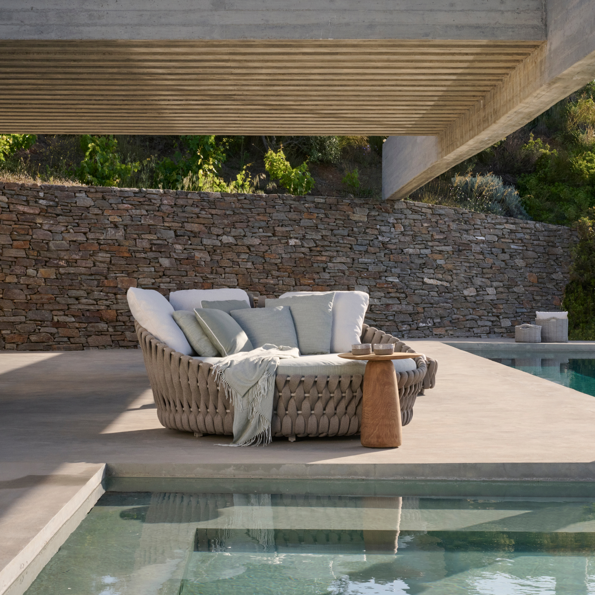 The Tosca outdoor collection by Monica Armani exudes warmth and elegance, featuring rounded forms, tapered powder-coated stainless-steel legs, and a braided seating shell in weather-resistant, soft-knit Textilene and polyolefin. Plush cushions enhance comfort, making the Tosca daybed a stylish and inviting retreat for outdoor relaxation.