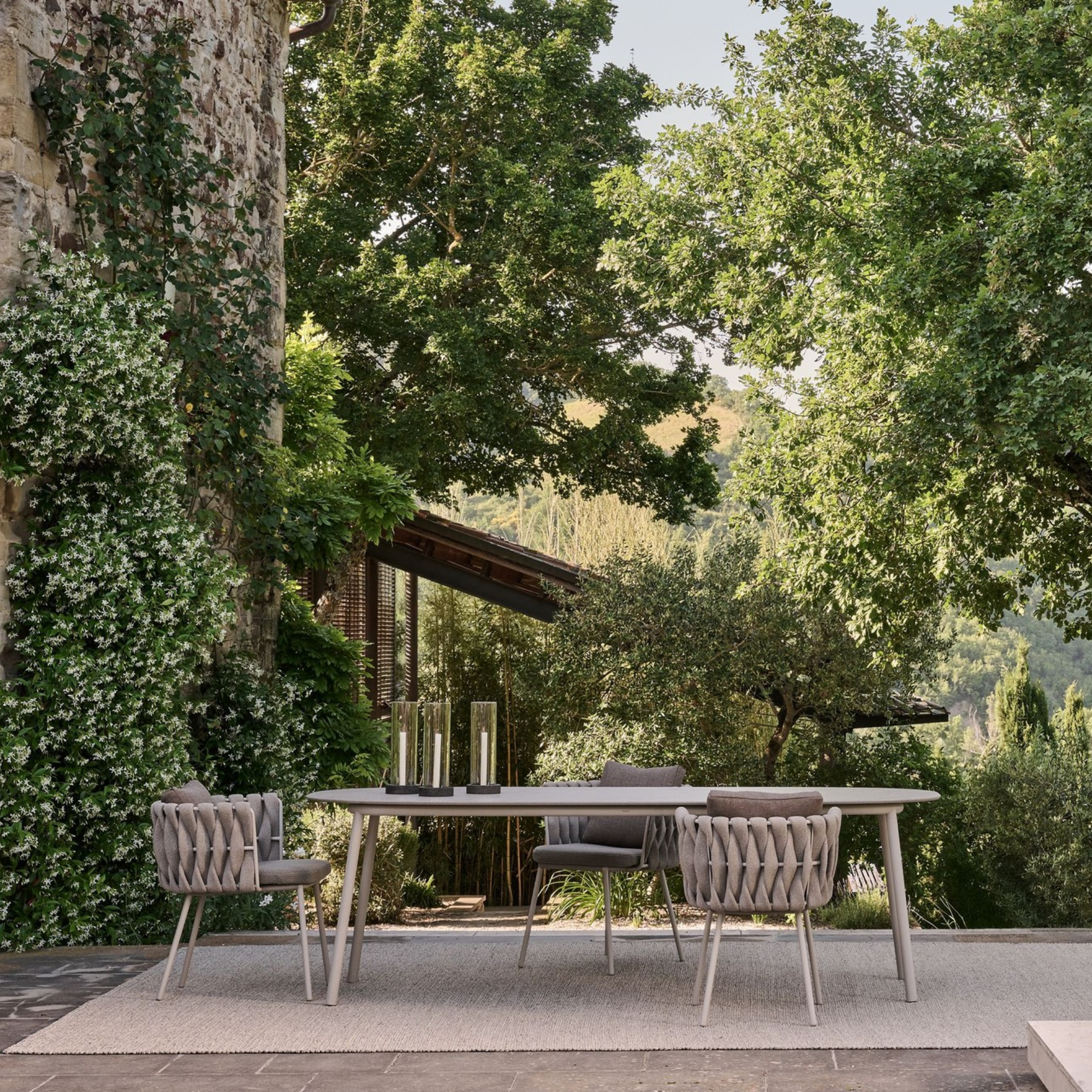 The Tosca dining table by Monica Armani features elegant tapered legs and a unique oval ceramic top, combining technical precision with refined beauty. Laminated on glass and CNC-milled, the UV-resistant, frost-proof, scratch- and stain-proof surface ensures durability and effortless maintenance, perfect for sophisticated outdoor dining.