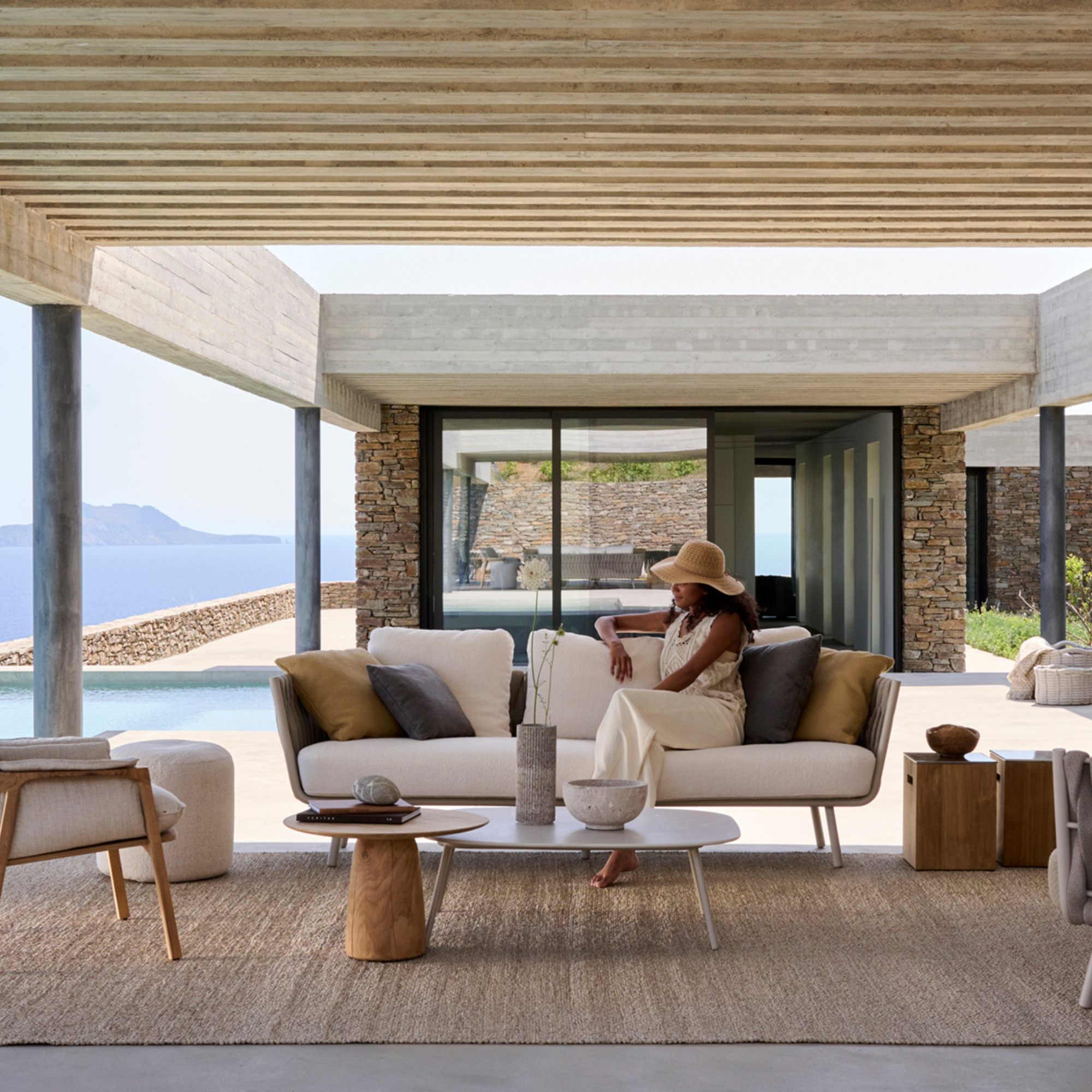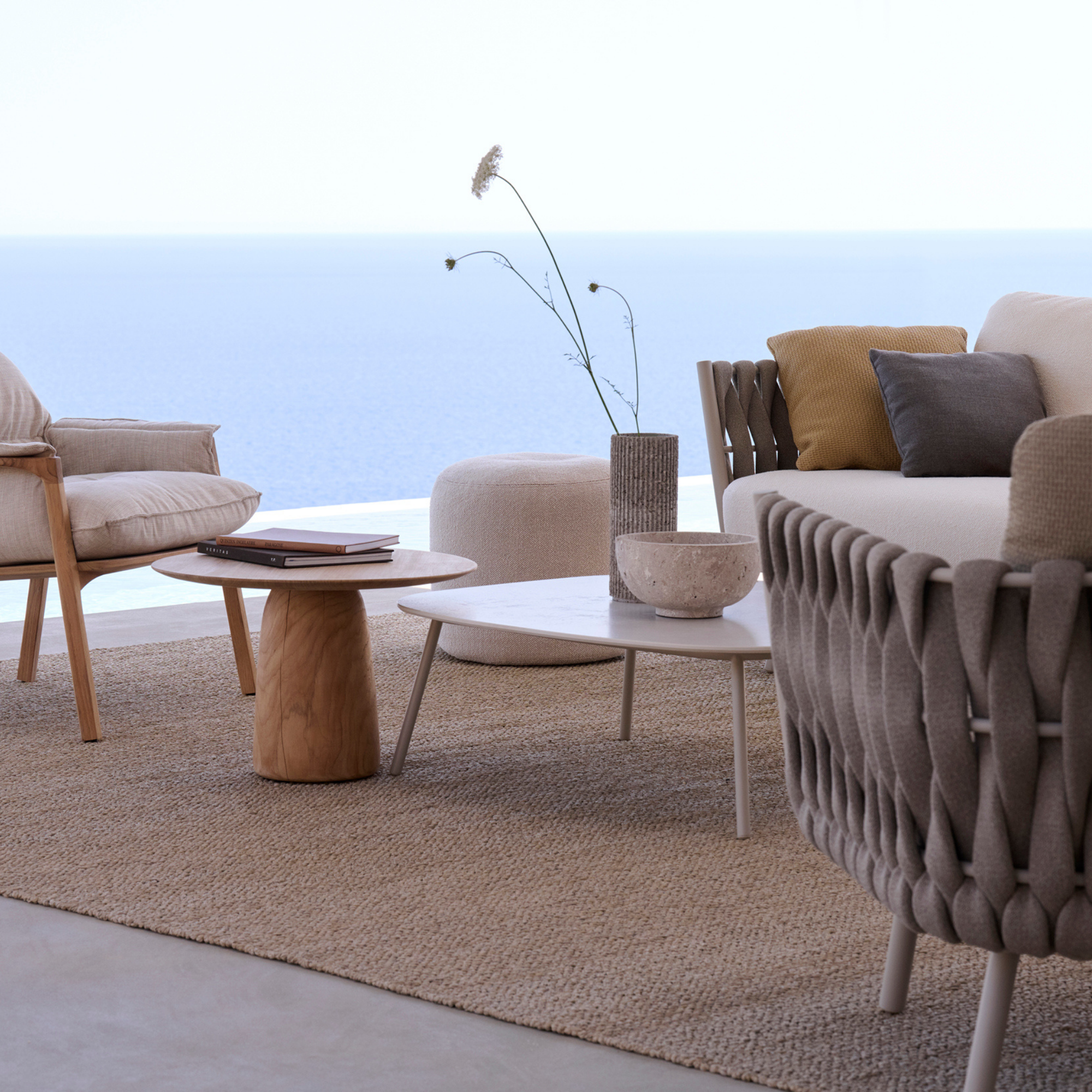 The Tosca coffee and side tables by Monica Armani feature elegant tapered legs and a distinctive oval ceramic top with a subtle cloud pattern. UV-resistant, frost-proof, scratch- and stain-proof, the ceramic surface ensures lasting beauty and easy maintenance, making them the perfect complement to refined outdoor settings.