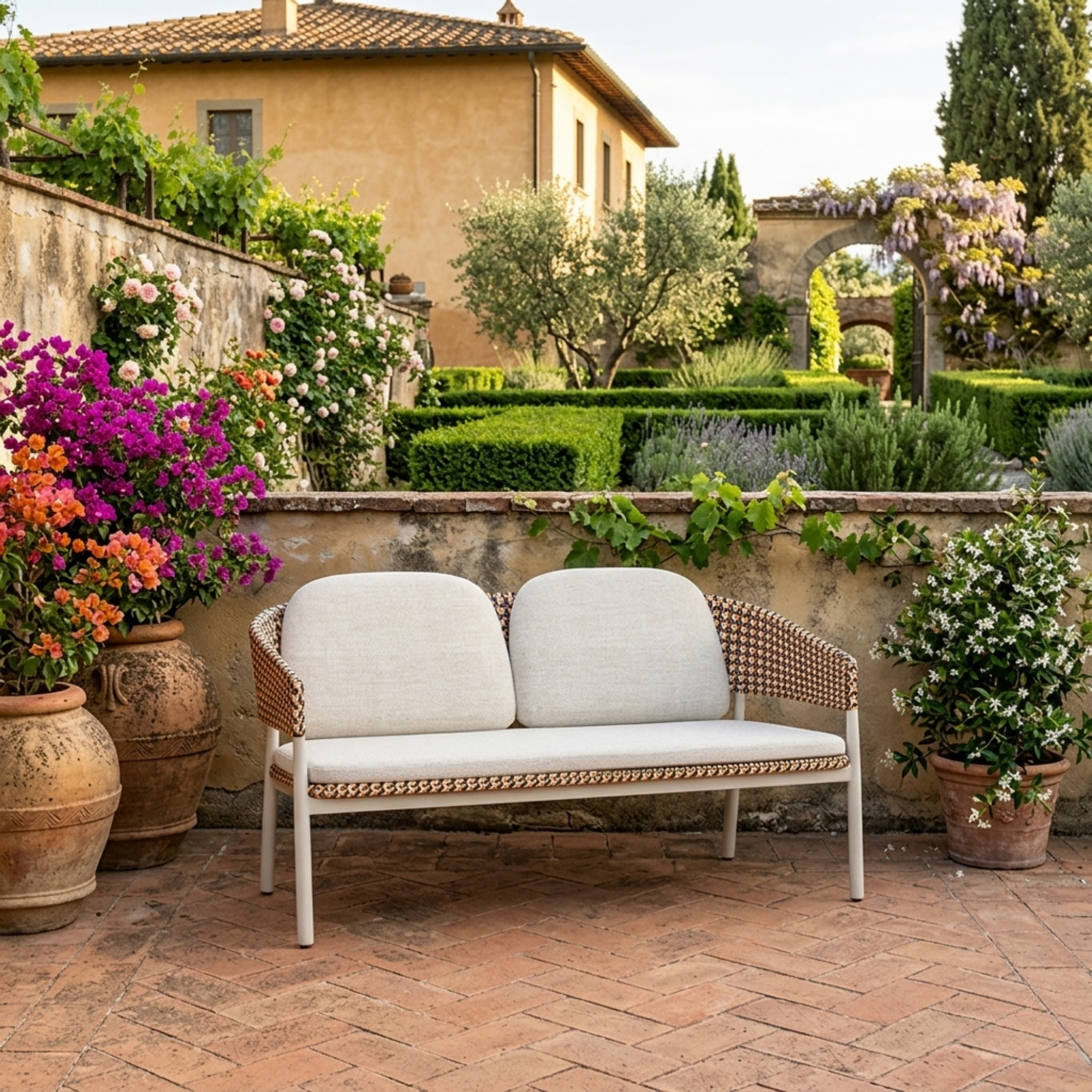 Sleek and sustainable, the Hipo 2‑Seater Lounge Chair from Vineko features a charcoal or linen powder-coated aluminum frame, hand‑woven PE rope in graceful vertical lines, and plush fossil or dune cushions — inspired by nature’s organic rhythm.