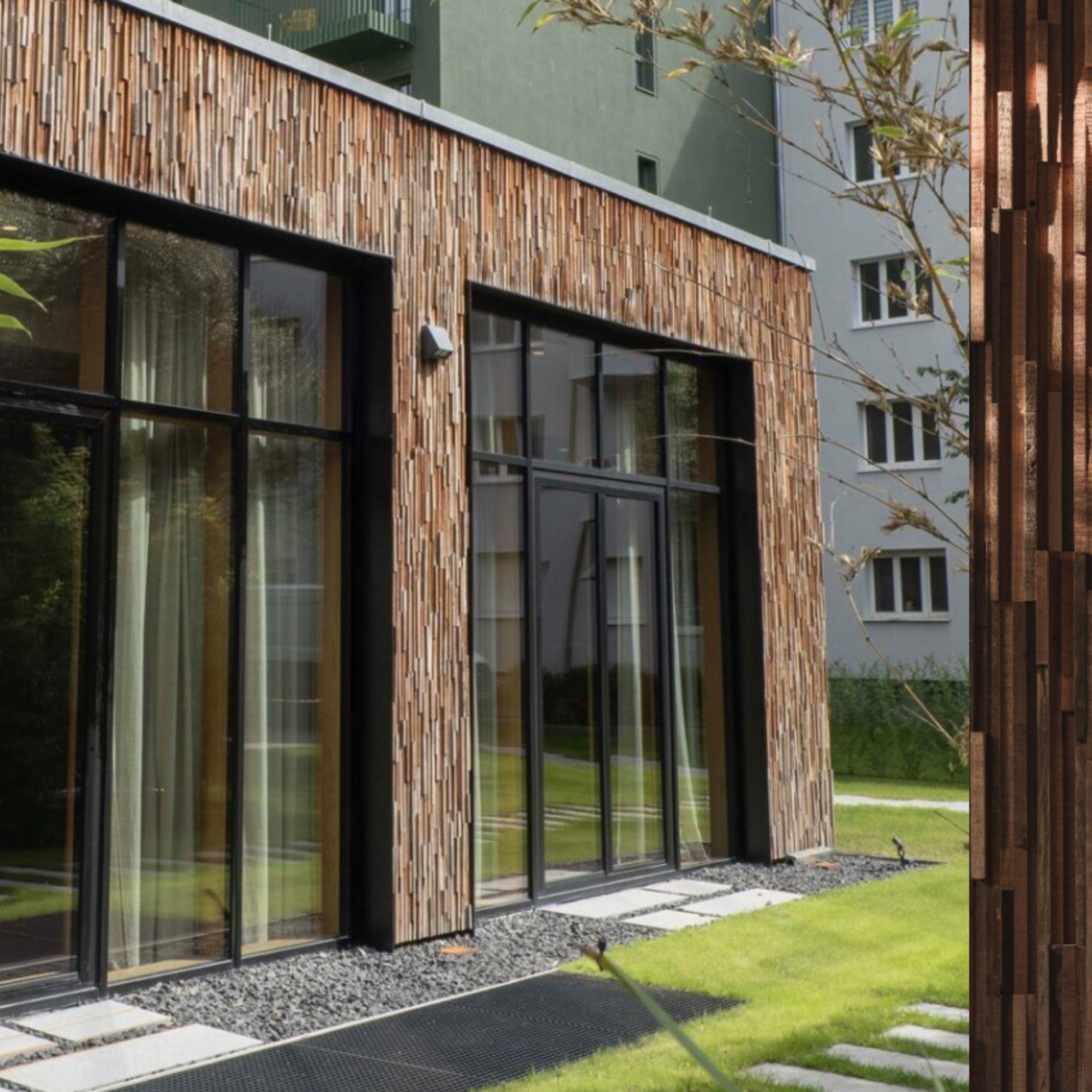 The Ludlow Panel by Wonderwall Studios is crafted from premium reclaimed Kalimantan hardwood, designed for both indoor and outdoor applications with exceptional weather resistance. Its layered, textured surface adds bold, sculptural character—ideal for feature walls in upscale hospitality and commercial settings.